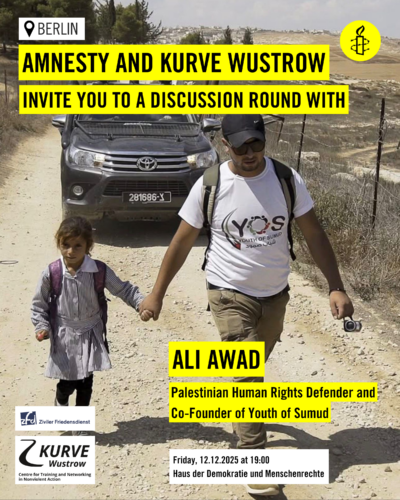 Join us for an evening dedicated to human rights, solidarity, and perspectives from the ground in Palestine. The Berlin Amnesty Group on Israel/Palestine welcomes Ali Awad from the West Bank, who brings firsthand insights into daily life under occupation, community resilience, and nonviolent resistance.